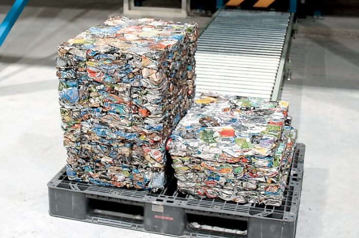 手選別コンベアで選別し、さらに缶用磁選機、アルミセパレーターで選別した個々の資源を、プレス機にかけ再利用可能な成型品として出荷します。