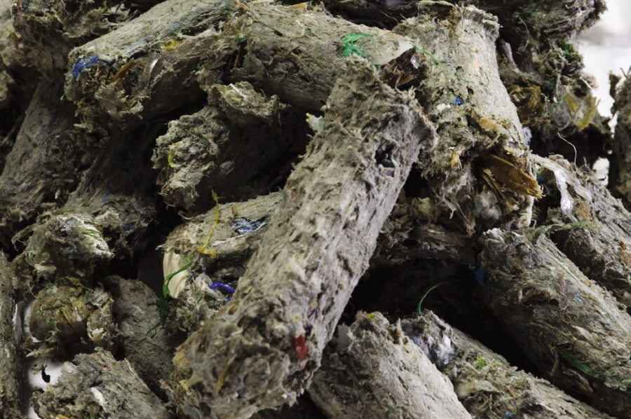 トロンメルから出た50mm以上の物は適切な速度で搬送され、選別人員により品目毎に選別します。廃プラスチック類、木くず、紙くず、繊維くずは固形燃料化(RPF)され、化石燃料に代わるボイラー燃料として活用します。また、非鉄金属、塩ビ材はマテリアルリサイクルします。