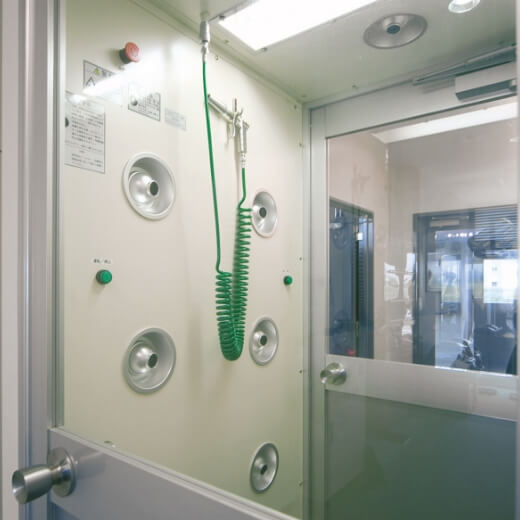 - 作業員は工場から出る際には必ずエアシャワー室を通り、ホコリや付着ゴミの流出を阻止。